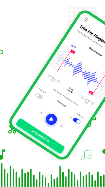 이 앱을 사용하는 것은 간단합니다. 사용자는 모바일 또는 녹음에서 MP3 또는 음악을 선택하고 자르고자 하는 영역을 선택할 수 있습니다. 이 앱은 오디오 파일의 스크롤 가능한 웨이브폼 표시를 4단계의 줌 레벨에서 제공합니다. 사용자는 선택적으로 터치 인터페이스를 사용하여 오디오 클립의 시작 및 종료 시간을 설정하거나 앱 하단의 텍스트 상자에 값을 수동으로 입력할 수 있습니다. 또한, 사용자는 새로운 클립의 이름을 지정하고 이를 저장하면서 기본 벨소리로 설정하거나 이 편집기를 사용하여 연락처에 할당할 수도 있습니다.